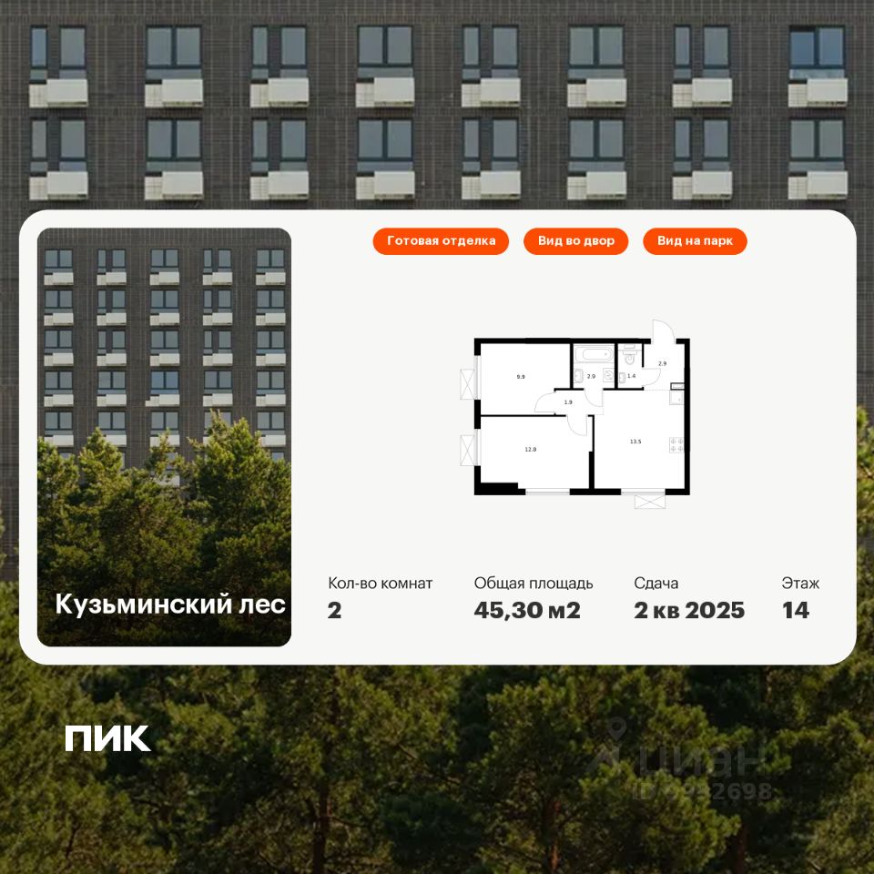 Продаётся 2-комн. квартира площадью 45,3 кв.м на 14 этаже 25 этажного дома (Корпус 10, Секция 1) проекта ПИК Кузьминский лес. Светлый просторный подъезд на уровне земли, функциональная планировка, большие окна, c отделкой.