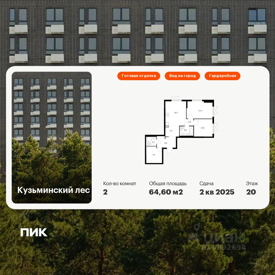 Продаётся 2-комн. квартира площадью 64,6 кв.м на 20 этаже 25 этажного дома (Корпус 10, Секция 1) проекта ПИК Кузьминский лес. Светлый просторный подъезд на уровне земли, функциональная планировка, большие окна, c отделкой.