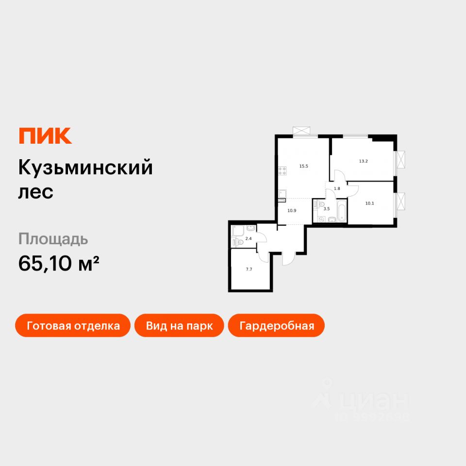 Продаётся 2-комн. квартира площадью 65,1 кв.м на 20 этаже 25 этажного дома (Корпус 10, Секция 1) проекта ПИК Кузьминский лес. Светлый просторный подъезд на уровне земли, функциональная планировка, большие окна, c отделкой.
