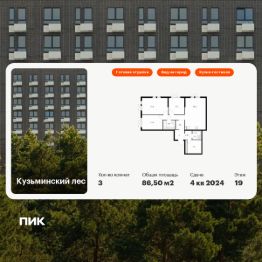Продаётся 3-комн. квартира площадью 86,5 кв.м на 19 этаже 25 этажного дома (Корпус 11, Секция 1) проекта ПИК Кузьминский лес. Светлый просторный подъезд на уровне земли, функциональная планировка, большие окна, c отделкой.