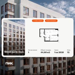 Продаётся 1-комн. квартира площадью 44,8 кв.м на 12 этаже 14 этажного дома (Корпус 16.1, Секция 2) проекта ПИК Белая Дача парк. Светлый просторный подъезд на уровне земли, функциональная планировка, большие окна, c отделкой.