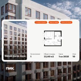 Продаётся 1-комн. квартира площадью 32,6 кв.м на 10 этаже 15 этажного дома (Корпус 16.1, Секция 4) проекта ПИК Белая Дача парк. Светлый просторный подъезд на уровне земли, функциональная планировка, большие окна, c отделкой.
