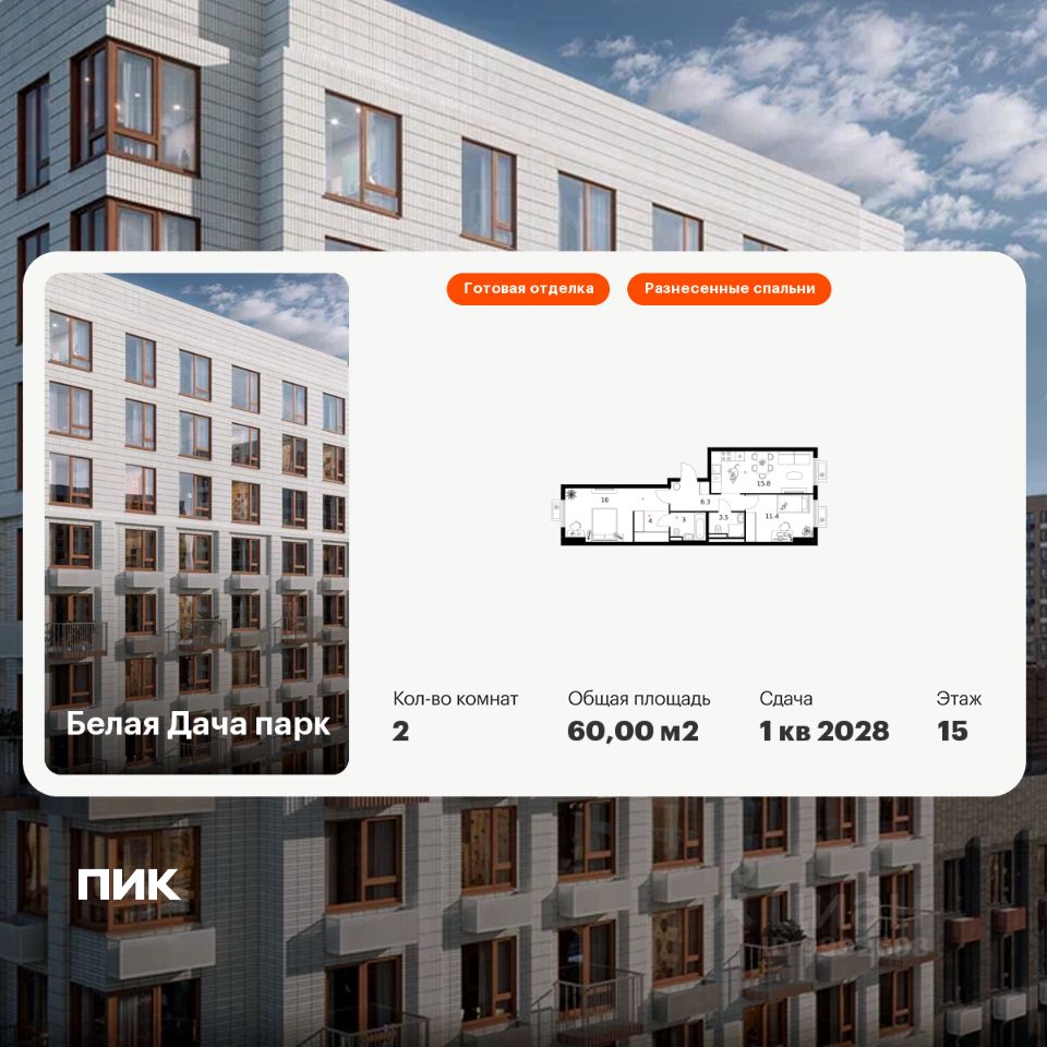 Продаётся 2-комн. квартира площадью 60 кв.м на 15 этаже 15 этажного дома (Корпус 16.1, Секция 4) проекта ПИК Белая Дача парк. Светлый просторный подъезд на уровне земли, функциональная планировка, большие окна, c отделкой.