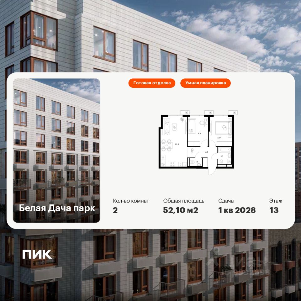 Продаётся 2-комн. квартира площадью 52,1 кв.м на 13 этаже 25 этажного дома (Корпус 16.1, Секция 1) проекта ПИК Белая Дача парк. Светлый просторный подъезд на уровне земли, функциональная планировка, большие окна, c отделкой.
