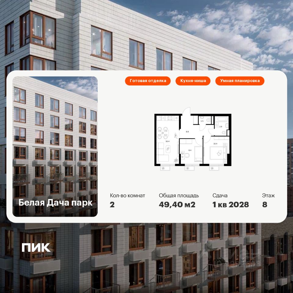 Продаётся 2-комн. квартира площадью 49,4 кв.м на 8 этаже 14 этажного дома (Корпус 16.1, Секция 2) проекта ПИК Белая Дача парк. Светлый просторный подъезд на уровне земли, функциональная планировка, большие окна, c отделкой.
