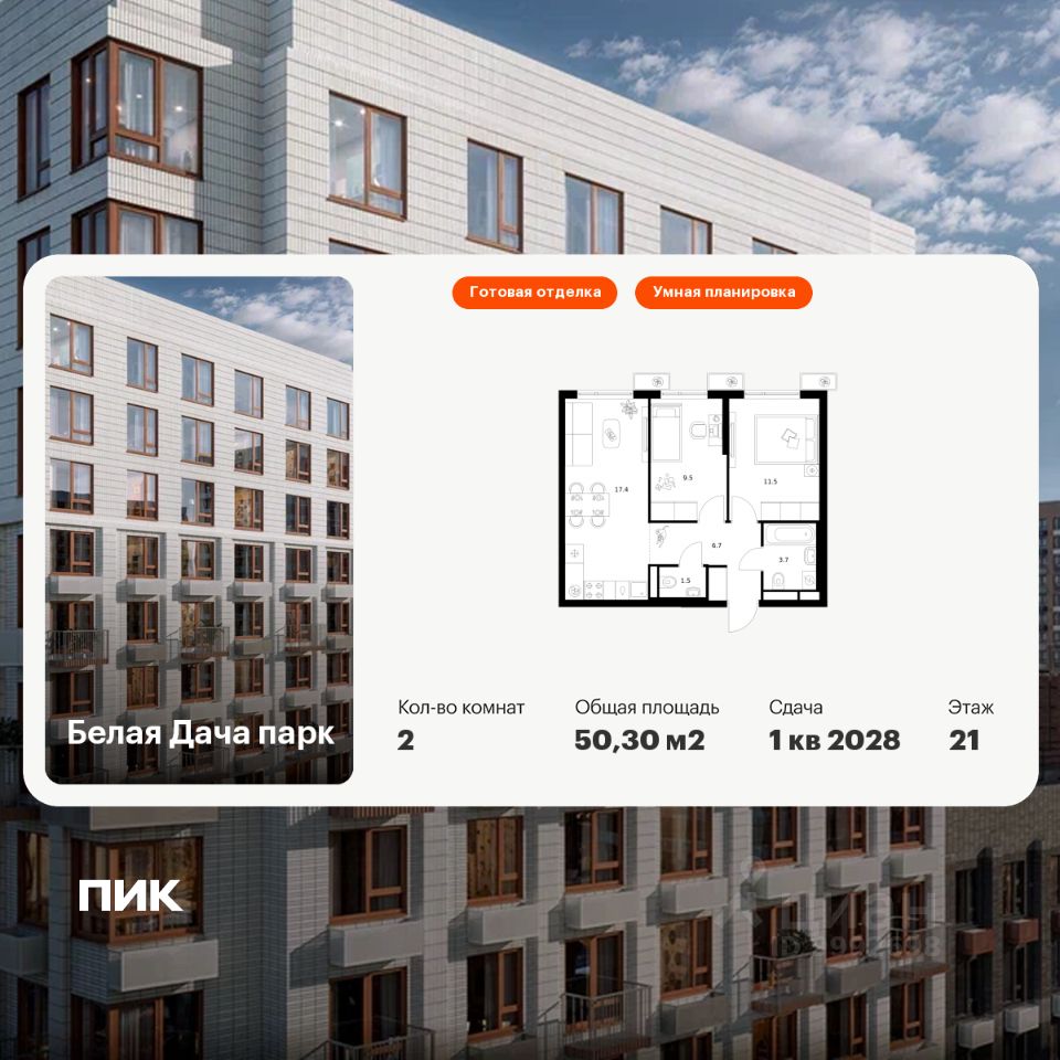Продаётся 2-комн. квартира площадью 50,3 кв.м на 21 этаже 25 этажного дома (Корпус 16.1, Секция 1) проекта ПИК Белая Дача парк. Светлый просторный подъезд на уровне земли, функциональная планировка, большие окна, c отделкой.