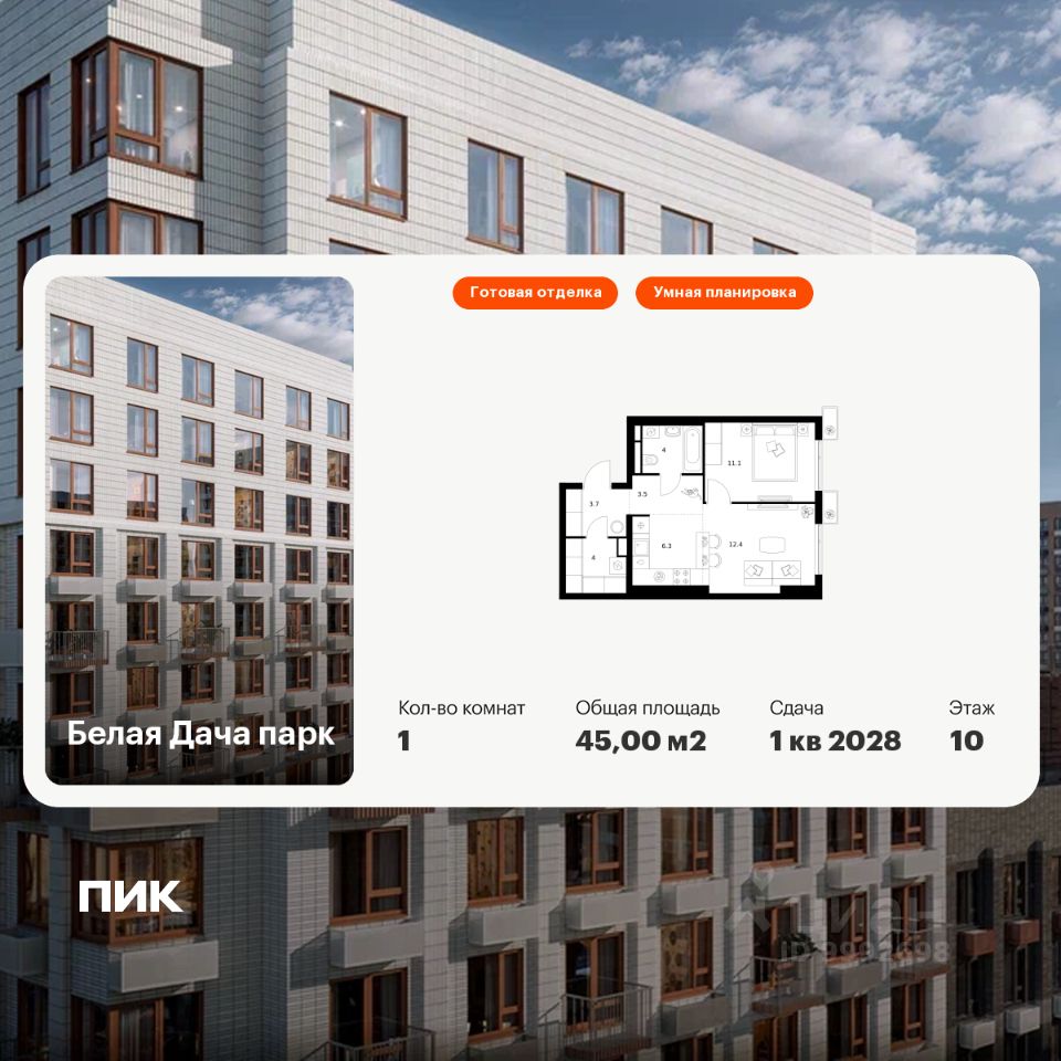Продаётся 1-комн. квартира площадью 45 кв.м на 10 этаже 14 этажного дома (Корпус 16.1, Секция 2) проекта ПИК Белая Дача парк. Светлый просторный подъезд на уровне земли, функциональная планировка, большие окна, c отделкой.
