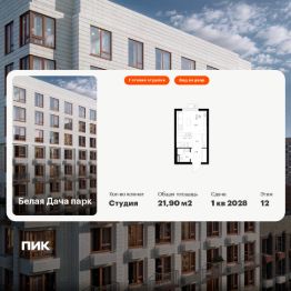 Продаётся квартира-студия площадью 21,9 кв.м на 12 этаже 15 этажного дома (Корпус 16.1, Секция 4) проекта ПИК Белая Дача парк. Светлый просторный подъезд на уровне земли, функциональная планировка, большие окна, c отделкой.
