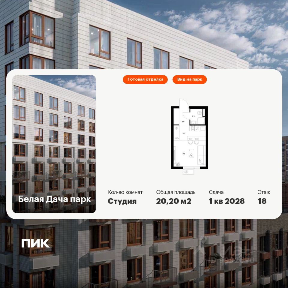 Продаётся квартира-студия площадью 20,2 кв.м на 18 этаже 25 этажного дома (Корпус 16.1, Секция 1) проекта ПИК Белая Дача парк. Светлый просторный подъезд на уровне земли, функциональная планировка, большие окна, c отделкой.