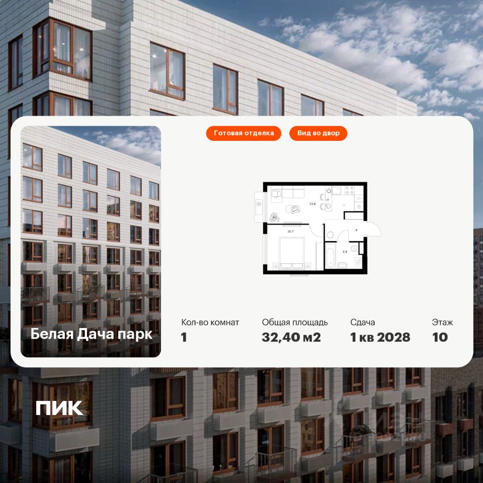 Продаётся 1-комн. квартира площадью 32,4 кв.м на 10 этаже 11 этажного дома (Корпус 16.2, Секция 8) проекта ПИК Белая Дача парк. Светлый просторный подъезд на уровне земли, функциональная планировка, большие окна, c отделкой.