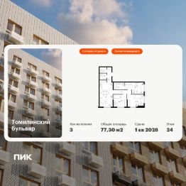 Продаётся 3-комн. квартира площадью 77,3 кв.м на 24 этаже 25 этажного дома (Корпус 5-8, Секция 2) проекта ПИК Томилинский бульвар. Светлый просторный подъезд на уровне земли, функциональная планировка, большие окна, c отделкой.