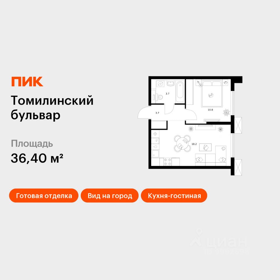 Продаётся 1-комн. квартира площадью 36,4 кв.м на 22 этаже 25 этажного дома (Корпус 5-8, Секция 2) проекта ПИК Томилинский бульвар. Светлый просторный подъезд на уровне земли, функциональная планировка, большие окна, c отделкой.