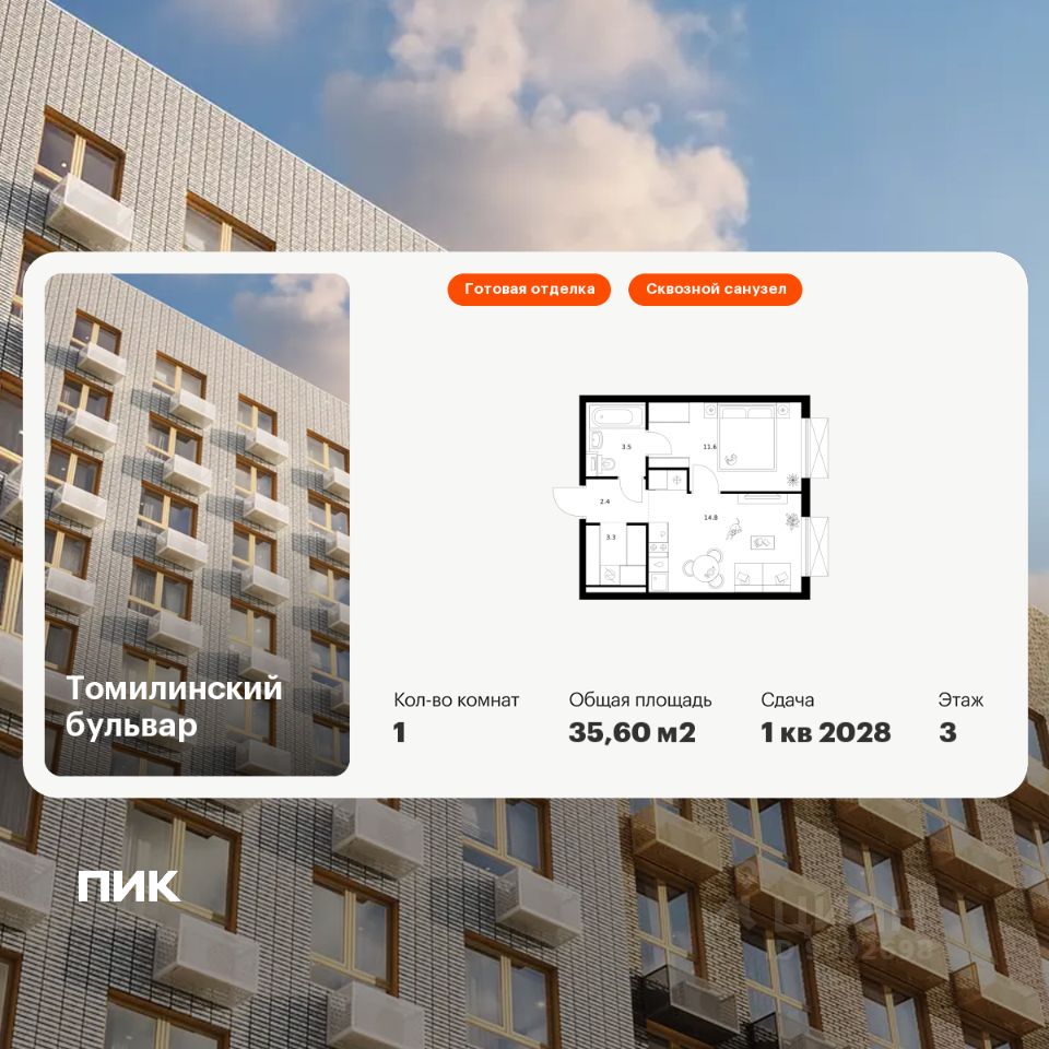 Продаётся 1-комн. квартира площадью 35,6 кв.м на 3 этаже 25 этажного дома (Корпус 5-8, Секция 2) проекта ПИК Томилинский бульвар. Светлый просторный подъезд на уровне земли, функциональная планировка, большие окна, c отделкой.