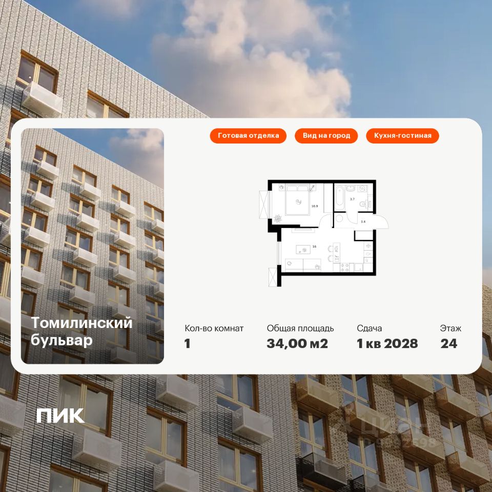 Продаётся 1-комн. квартира площадью 34 кв.м на 24 этаже 25 этажного дома (Корпус 5-8, Секция 2) проекта ПИК Томилинский бульвар. Светлый просторный подъезд на уровне земли, функциональная планировка, большие окна, c отделкой.