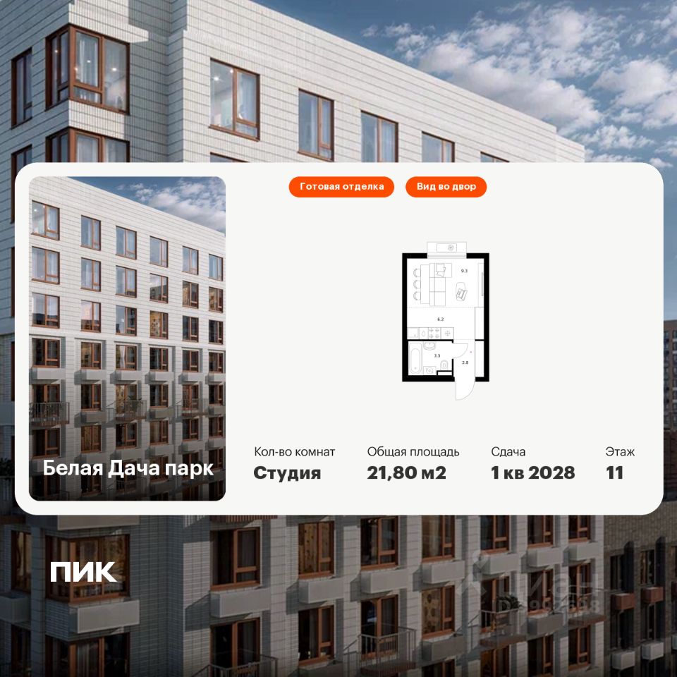 Продаётся квартира-студия площадью 21,8 кв.м на 11 этаже 15 этажного дома (Корпус 16.1, Секция 4) проекта ПИК Белая Дача парк. Светлый просторный подъезд на уровне земли, функциональная планировка, большие окна, c отделкой.