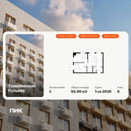 Продаётся 2-комн. квартира площадью 50,8 кв.м на 6 этаже 25 этажного дома (Корпус 5-8, Секция 2) проекта ПИК Томилинский бульвар. Светлый просторный подъезд на уровне земли, функциональная планировка, большие окна, c отделкой.