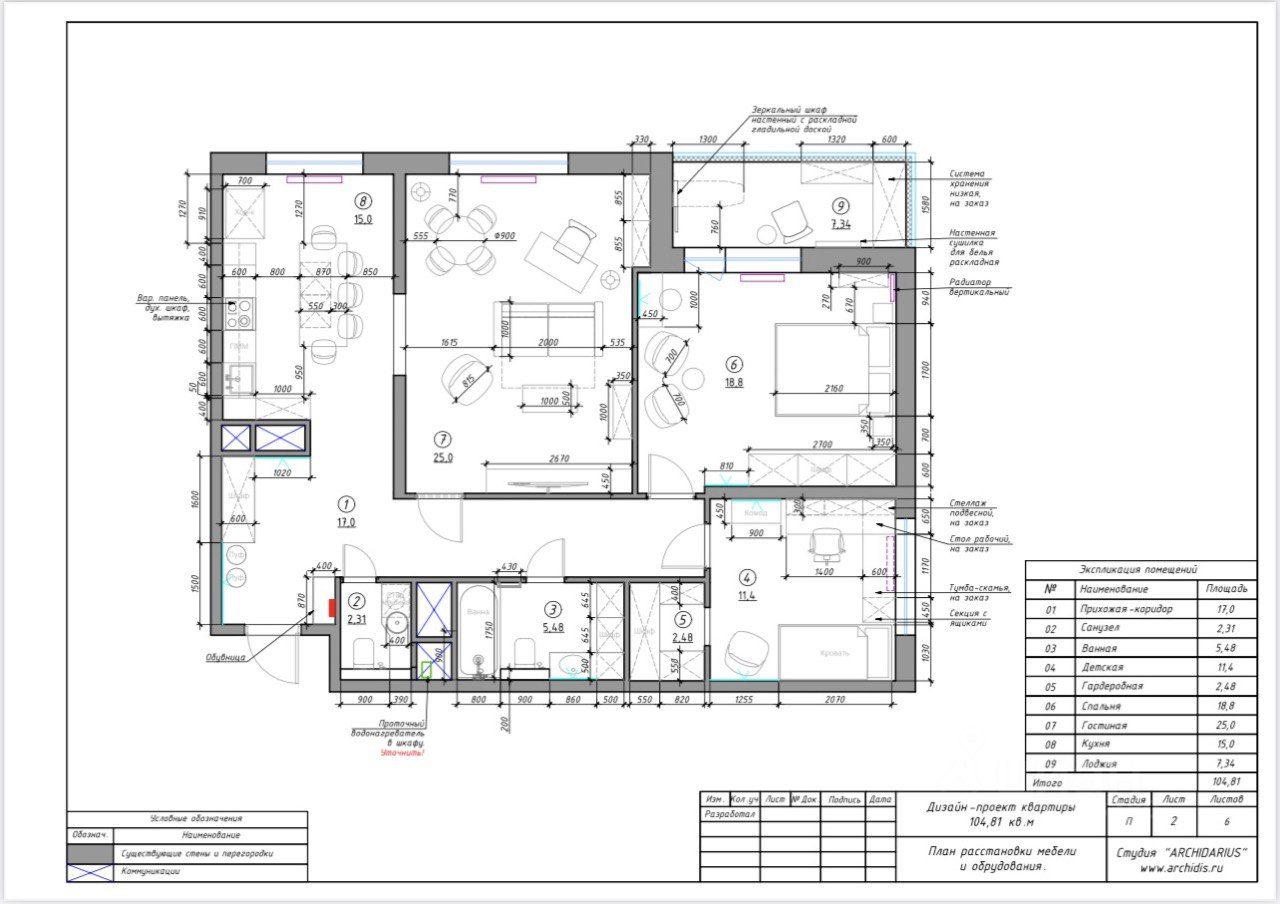 Расстановка мебели с размерами и расчетами сделанна совместно с дизайнером.