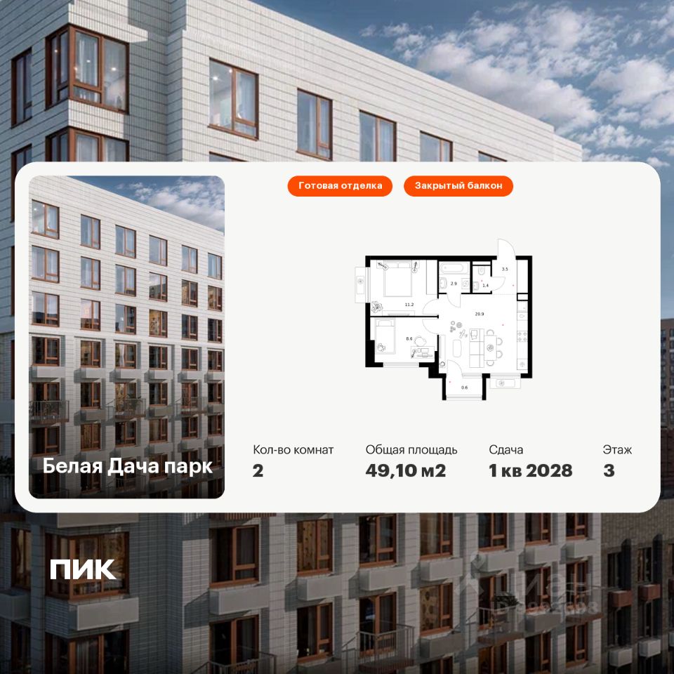 Продаётся 2-комн. квартира площадью 49,1 кв.м на 3 этаже 11 этажного дома (Корпус 16.2, Секция 8) проекта ПИК Белая Дача парк. Светлый просторный подъезд на уровне земли, функциональная планировка, большие окна, c отделкой.