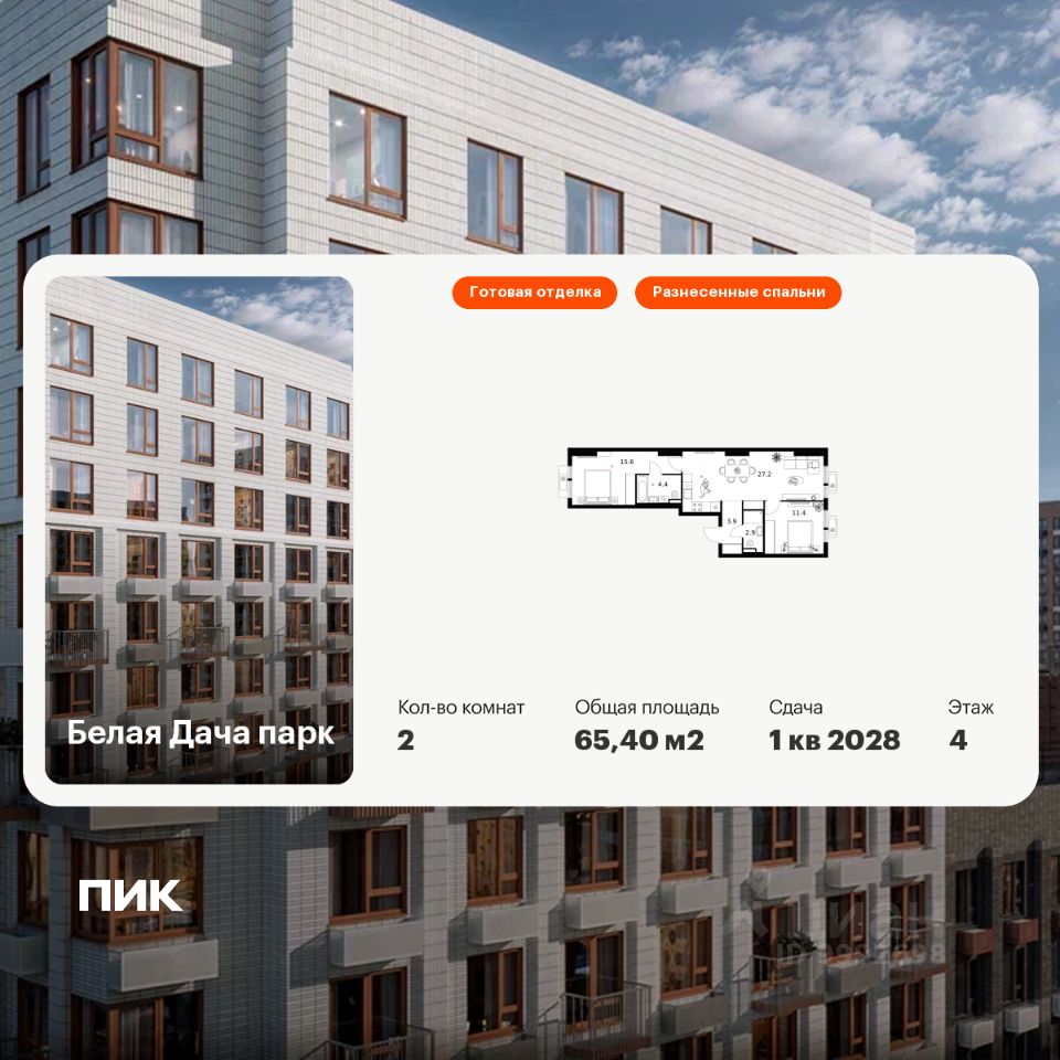 Продаётся 2-комн. квартира площадью 65,4 кв.м на 4 этаже 25 этажного дома (Корпус 16.2, Секция 5) проекта ПИК Белая Дача парк. Светлый просторный подъезд на уровне земли, функциональная планировка, большие окна, c отделкой.