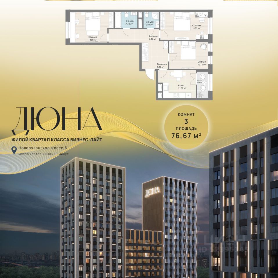 Продаётся 3-комнатная квартира в строящемся доме (Корпус 4), срок сдачи: II-кв. 2028, общей площадью 76.67 кв.м., на 14 этаже. Многоквартирный жилой комплекс с подземной автостоянкой и встроенно-пристроенным ДОУ на 120 мест по адресу: Московская область, г.о. Котельники, Новорязанское шоссе, вл. 6, комплекс 1