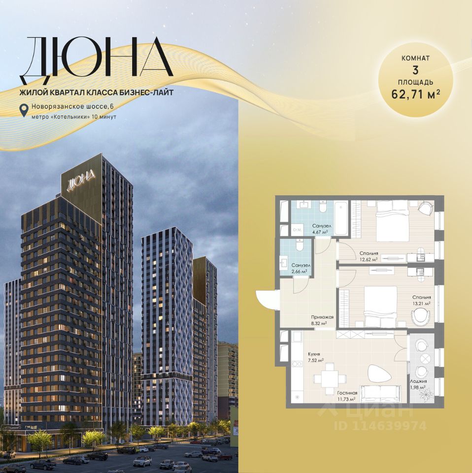 Современный жилой квартал бизнес-класса "Дюна" расположен в 10 минутах ходьбы от станции метро "Котельники" (1,2 км) на пересечении Новорязанского и Дзержинского шоссе. Квартал находится в районе с развитой инфраструктурой: в непосредственной близости расположены школы, детские сады, поликлиники, а также гипермаркеты и торговые комплексы, такие как "Metro", "Глобус", "Лемана Про" (Леруа Мерлен), "МЕГА Белая Дача", "Outlet Village Белая Дача" и другие. В шаговой доступности находятся физкультурно-оздоровительный комплекс с бассейном и теннисными кортами, а также благоустроенный лесопарк "Кузьминки" площадью 1189 га. Неподалёку расположены пляжи Дзержинских карьеров с экстрим-парком и горнолыжными трассами, Томилинский лесопарк с лыжной базой и Жулебинский лесопарк. Застройщик реализует современную урбанистическую концепцию "Город в городе", которая подразумевает наличие собственной полноценной инфраструктуры на территории жилого комплекса, включая школу, детские сады, торговую галерею, бизнес-центр, пункт полиции и медицинский центр. Общая площадь застройки составляет 12,2 га. Квартиры представлены в диапазоне планировок от студий до четырёхкомнатных, в обычном и евроформате. На этажах расположено от 3 до 4 бесшумных скоростных лифтов при количестве квартир от 4 до 7 на этаже. Квартиры сдаются с предчистовой отделкой (white box). Здания переменной этажности строятся по технологии монолит-кирпич, а фасады выполнены с использованием инновационной системы вентилируемого комбинированного фасада.Комфорт на внутренней территории обеспечивается за счёт принципа "двор без машин", системы доступа по карте и круглосуточного видеонаблюдения. Приобрести квартиру можно с использованием материнского капитала, беспроцентной рассрочки или ипотечных программ. При 100% оплате предусмотрены индивидуальные условия.