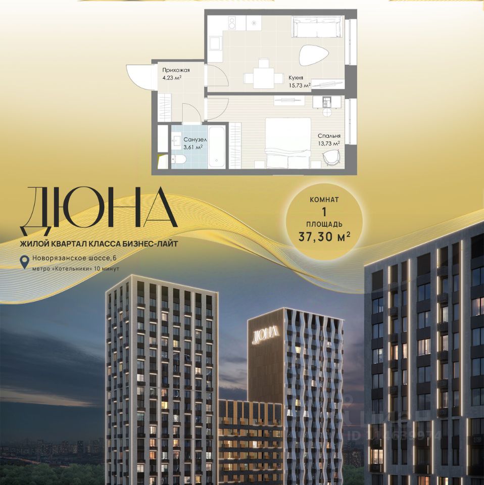 Современный жилой квартал бизнес-класса "Дюна" расположен в 10 минутах ходьбы от станции метро "Котельники" (1,2 км) на пересечении Новорязанского и Дзержинского шоссе. Квартал находится в районе с развитой инфраструктурой: в непосредственной близости расположены школы, детские сады, поликлиники, а также гипермаркеты и торговые комплексы, такие как "Metro", "Глобус", "Лемана Про" (Леруа Мерлен), "МЕГА Белая Дача", "Outlet Village Белая Дача" и другие. В шаговой доступности находятся физкультурно-оздоровительный комплекс с бассейном и теннисными кортами, а также благоустроенный лесопарк "Кузьминки" площадью 1189 га. Неподалёку расположены пляжи Дзержинских карьеров с экстрим-парком и горнолыжными трассами, Томилинский лесопарк с лыжной базой и Жулебинский лесопарк. Застройщик реализует современную урбанистическую концепцию "Город в городе", которая подразумевает наличие собственной полноценной инфраструктуры на территории жилого комплекса, включая школу, детские сады, торговую галерею, бизнес-центр, пункт полиции и медицинский центр. Общая площадь застройки составляет 12,2 га. Квартиры представлены в диапазоне планировок от студий до четырёхкомнатных, в обычном и евроформате. На этажах расположено от 3 до 4 бесшумных скоростных лифтов при количестве квартир от 4 до 7 на этаже. Квартиры сдаются с предчистовой отделкой (white box). Здания переменной этажности строятся по технологии монолит-кирпич, а фасады выполнены с использованием инновационной системы вентилируемого комбинированного фасада.Комфорт на внутренней территории обеспечивается за счёт принципа "двор без машин", системы доступа по карте и круглосуточного видеонаблюдения. Приобрести квартиру можно с использованием материнского капитала, беспроцентной рассрочки или ипотечных программ. При 100% оплате предусмотрены индивидуальные условия.
