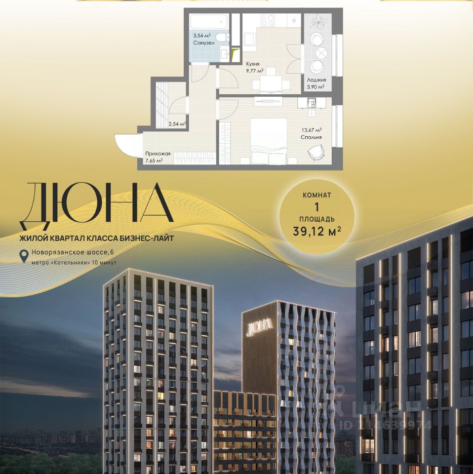 Современный жилой квартал бизнес-класса "Дюна" расположен в 10 минутах ходьбы от станции метро "Котельники" (1,2 км) на пересечении Новорязанского и Дзержинского шоссе. Квартал находится в районе с развитой инфраструктурой: в непосредственной близости расположены школы, детские сады, поликлиники, а также гипермаркеты и торговые комплексы, такие как "Metro", "Глобус", "Лемана Про" (Леруа Мерлен), "МЕГА Белая Дача", "Outlet Village Белая Дача" и другие. В шаговой доступности находятся физкультурно-оздоровительный комплекс с бассейном и теннисными кортами, а также благоустроенный лесопарк "Кузьминки" площадью 1189 га. Неподалёку расположены пляжи Дзержинских карьеров с экстрим-парком и горнолыжными трассами, Томилинский лесопарк с лыжной базой и Жулебинский лесопарк. Застройщик реализует современную урбанистическую концепцию "Город в городе", которая подразумевает наличие собственной полноценной инфраструктуры на территории жилого комплекса, включая школу, детские сады, торговую галерею, бизнес-центр, пункт полиции и медицинский центр. Общая площадь застройки составляет 12,2 га. Квартиры представлены в диапазоне планировок от студий до четырёхкомнатных, в обычном и евроформате. На этажах расположено от 3 до 4 бесшумных скоростных лифтов при количестве квартир от 4 до 7 на этаже. Квартиры сдаются с предчистовой отделкой (white box). Здания переменной этажности строятся по технологии монолит-кирпич, а фасады выполнены с использованием инновационной системы вентилируемого комбинированного фасада.Комфорт на внутренней территории обеспечивается за счёт принципа "двор без машин", системы доступа по карте и круглосуточного видеонаблюдения. Приобрести квартиру можно с использованием материнского капитала, беспроцентной рассрочки или ипотечных программ. При 100% оплате предусмотрены индивидуальные условия.
