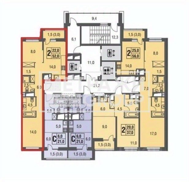 - Площадь комнат 8м2 и 14м2, просторная кухня - 14м2;
