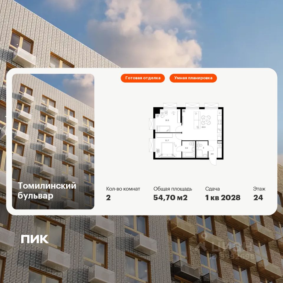 Продаётся 2-комн. квартира площадью 54,7 кв.м на 24 этаже 25 этажного дома (Корпус 5-8, Секция 2) проекта ПИК Томилинский бульвар. Светлый просторный подъезд на уровне земли, функциональная планировка, большие окна, c отделкой.