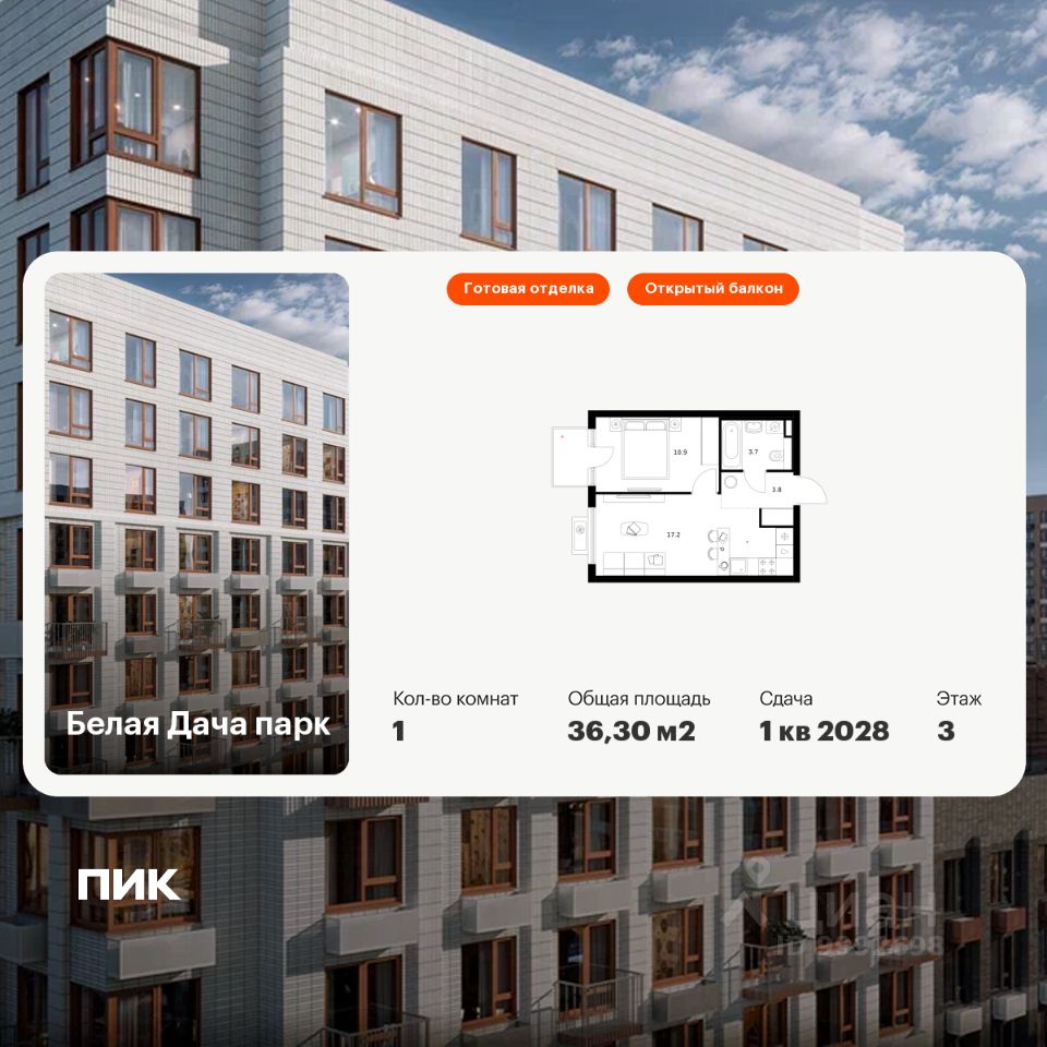 Продаётся 1-комн. квартира площадью 36,3 кв.м на 3 этаже 25 этажного дома (Корпус 16.2, Секция 5) проекта ПИК Белая Дача парк. Светлый просторный подъезд на уровне земли, функциональная планировка, большие окна, c отделкой.