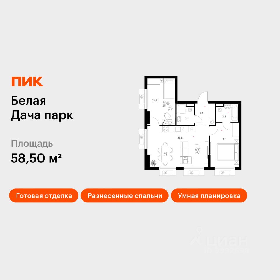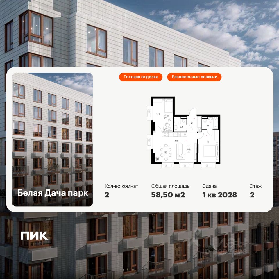 Продаётся 2-комн. квартира площадью 58,5 кв.м на 2 этаже 15 этажного дома (Корпус 16.1, Секция 4) проекта ПИК Белая Дача парк. Светлый просторный подъезд на уровне земли, функциональная планировка, большие окна, c отделкой.