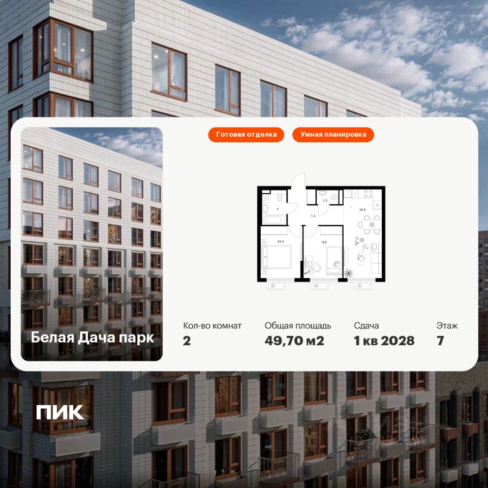 Продаётся 2-комн. квартира площадью 49,7 кв.м на 7 этаже 15 этажного дома (Корпус 16.1, Секция 4) проекта ПИК Белая Дача парк. Светлый просторный подъезд на уровне земли, функциональная планировка, большие окна, c отделкой.