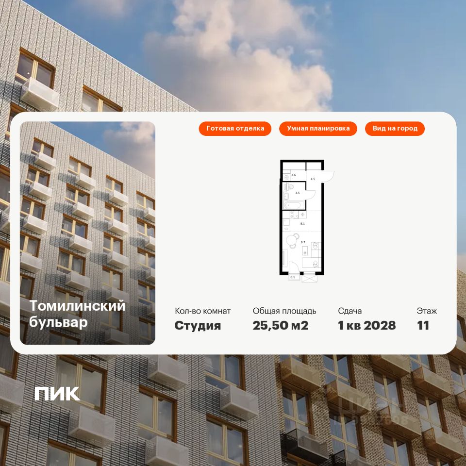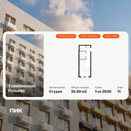 Продаётся квартира-студия площадью 25,5 кв.м на 11 этаже 25 этажного дома (Корпус 5-8, Секция 1) проекта ПИК Томилинский бульвар. Светлый просторный подъезд на уровне земли, функциональная планировка, большие окна, c отделкой.