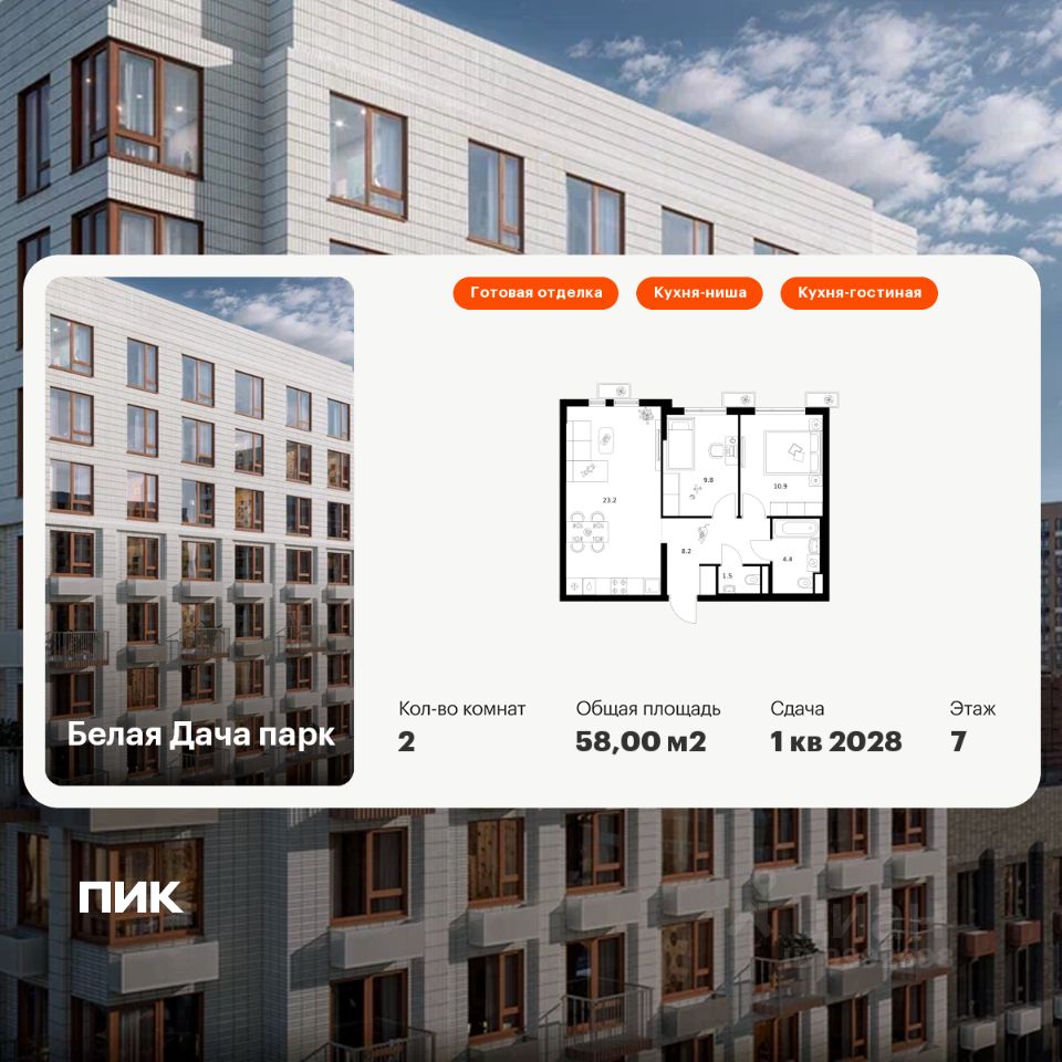 Продаётся 2-комн. квартира площадью 58 кв.м на 7 этаже 14 этажного дома (Корпус 16.1, Секция 2) проекта ПИК Белая Дача парк. Светлый просторный подъезд на уровне земли, функциональная планировка, большие окна, c отделкой.
