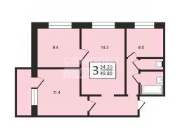 Квартира со смежно-изолированной планировкой: комнаты (14.3+11.4+8.5), кухня 6 кв.м., раздельный с/у, просторный коридор, балкон.
