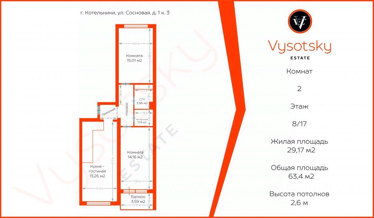 Площадь по ЕГРН - 63.4 м2. Окна выходят на 2 стороны.