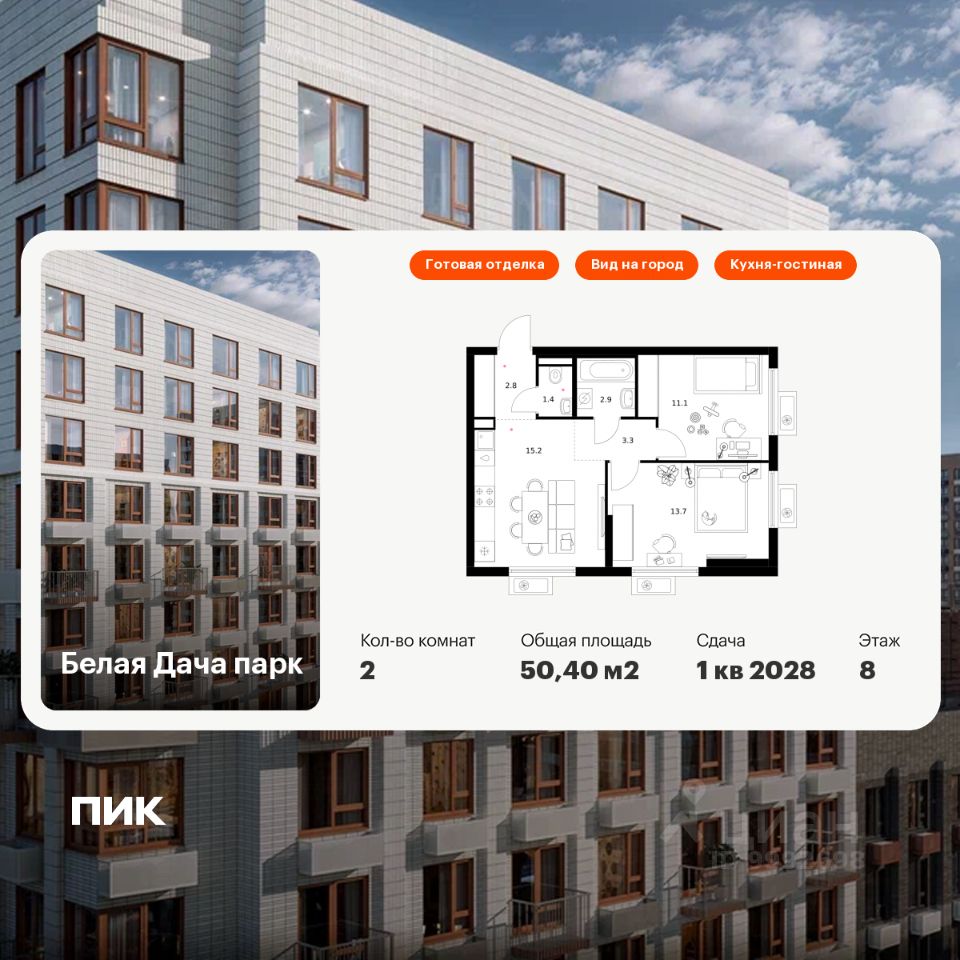 Продаётся 2-комн. квартира площадью 50,4 кв.м на 8 этаже 25 этажного дома (Корпус 16.2, Секция 5) проекта ПИК Белая Дача парк. Светлый просторный подъезд на уровне земли, функциональная планировка, большие окна, c отделкой.
