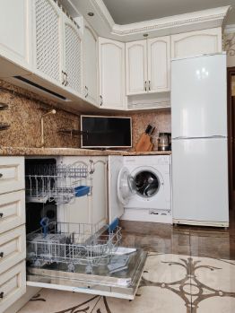 Кухня просторная и светлая, фасад из массива. Весь кухонный гарнитур и встроенная бытовая техника остаются покупателю (стиральная машина, посудомоечная машина, плита и духовой шкаф).