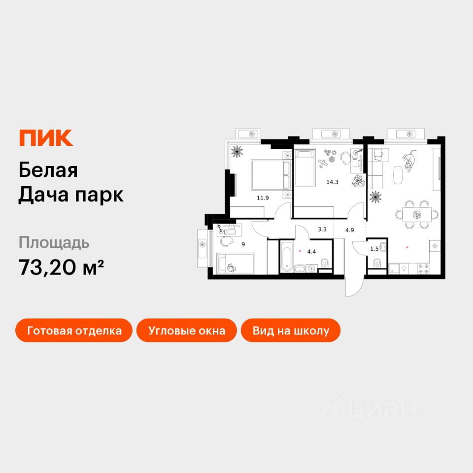 Продаётся 3-комн. квартира площадью 73,2 кв.м на 2 этаже 19 этажного дома (Корпус 16.1, Секция 3) проекта ПИК Белая Дача парк. Светлый просторный подъезд на уровне земли, функциональная планировка, большие окна, c отделкой.