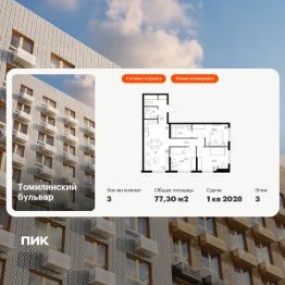 Продаётся 3-комн. квартира площадью 77,3 кв.м на 3 этаже 25 этажного дома (Корпус 5-8, Секция 2) проекта ПИК Томилинский бульвар. Светлый просторный подъезд на уровне земли, функциональная планировка, большие окна, c отделкой.