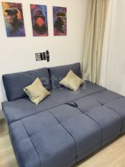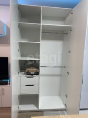 Квартира реализуется с полной меблировкой и качественной техникой, что позволяет заехать сразу после сделки. В комплектацию входят два вместительных шкафа со встроенной гладильной доской, функциональный кухонный гарнитур со встроенной системой фильтрации воды, духовым шкафом, микроволновой печью, вытяжкой и холодильником, а также продуманная атмосферная подсветка. Вся мебель была изготовлена на заказ из МДФ, что гарантирует ее долговечность и эргономичность.