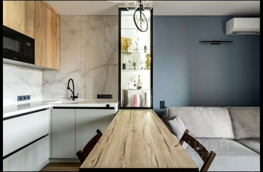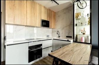 - рабочая зона: современный кухонный гарнитур, стеклянный сервант, широкоформатный керамогранит до потолка 160 см х 80 см, каменная столешница с интегрированной раковиной, встроенная техника (полноразмерная посудомоечная машина, духовой шкаф, микроволновая печь, холодильник, вытяжка)