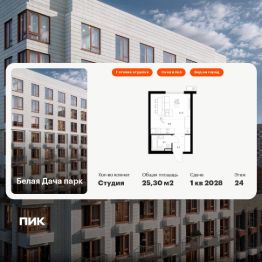 Продаётся квартира-студия площадью 25,3 кв.м на 24 этаже 25 этажного дома (Корпус 16.2, Секция 5) проекта ПИК Белая Дача парк. Светлый просторный подъезд на уровне земли, функциональная планировка, большие окна, c отделкой.