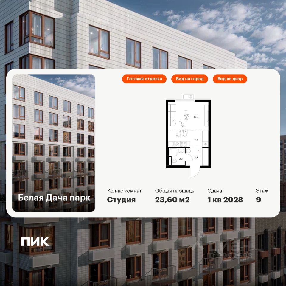 Продаётся квартира-студия площадью 23,6 кв.м на 9 этаже 15 этажного дома (Корпус 16.1, Секция 4) проекта ПИК Белая Дача парк. Светлый просторный подъезд на уровне земли, функциональная планировка, большие окна, c отделкой.