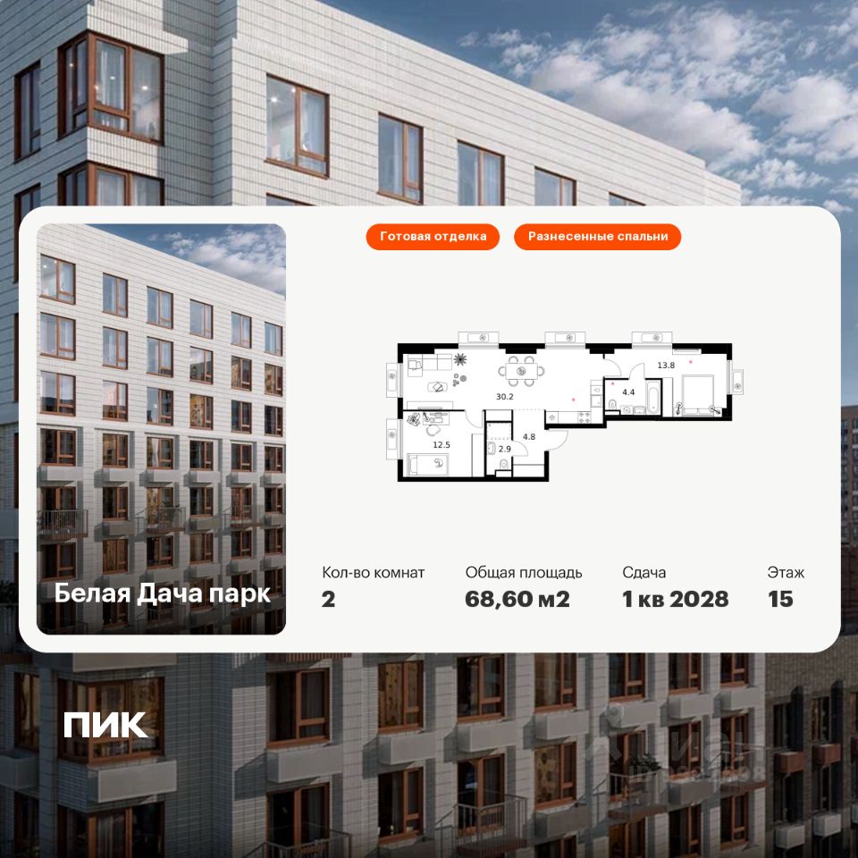 Продаётся 2-комн. квартира площадью 68,6 кв.м на 15 этаже 20 этажного дома (Корпус 16.2, Секция 7) проекта ПИК Белая Дача парк. Светлый просторный подъезд на уровне земли, функциональная планировка, большие окна, c отделкой.