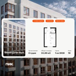 Продаётся квартира-студия площадью 24,8 кв.м на 19 этаже 19 этажного дома (Корпус 16.1, Секция 3) проекта ПИК Белая Дача парк. Светлый просторный подъезд на уровне земли, функциональная планировка, большие окна, c отделкой.