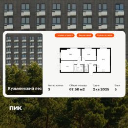 Продаётся 3-комн. квартира площадью 67,5 кв.м на 5 этаже 25 этажного дома (Корпус 10, Секция 1) проекта ПИК Кузьминский лес. Светлый просторный подъезд на уровне земли, функциональная планировка, большие окна, c отделкой.