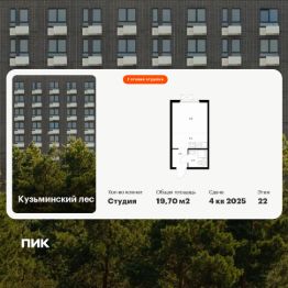 Продаётся квартира-студия площадью 19,7 кв.м на 22 этаже 25 этажного дома (Корпус 12, Секция 1) проекта ПИК Кузьминский лес. Светлый просторный подъезд на уровне земли, функциональная планировка, большие окна, c отделкой.