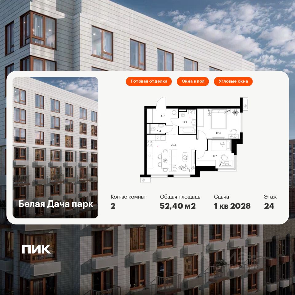 Продаётся 2-комн. квартира площадью 52,4 кв.м на 24 этаже 25 этажного дома (Корпус 16.2, Секция 5) проекта ПИК Белая Дача парк. Светлый просторный подъезд на уровне земли, функциональная планировка, большие окна, c отделкой.