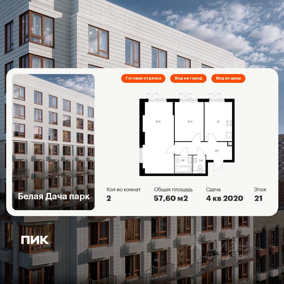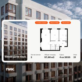 Продаётся 2-комн. квартира площадью 57,6 кв.м на 21 этаже 25 этажного дома (Корпус 7.1, Секция 1) проекта ПИК Белая Дача парк. Светлый просторный подъезд на уровне земли, функциональная планировка, большие окна, c отделкой.